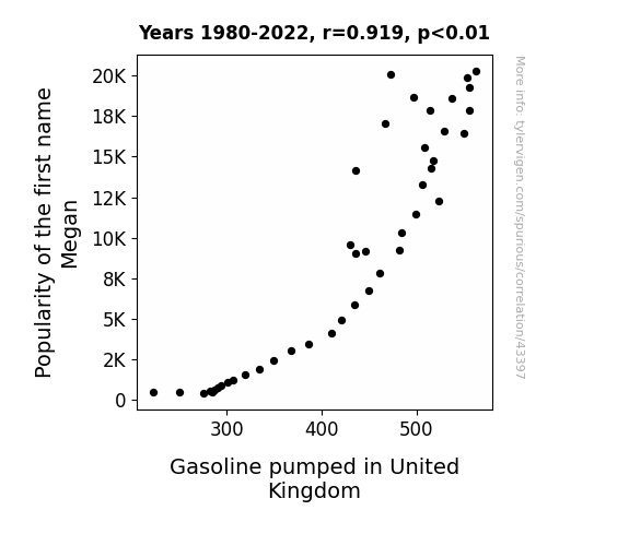 This means 84.5% of the change in the one variable (i.e., Gasoline pumped in United Kingdom) is predictable based on the change in the other (i.e., Popularity of the first name Megan) over the 43 years from 1980 through 2022.