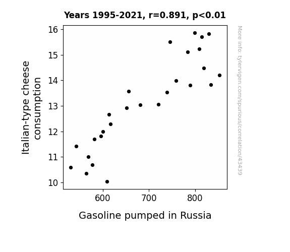 This means 79.4% of the change in the one variable (i.e., Gasoline pumped in Russia) is predictable based on the change in the other (i.e., Italian-type cheese consumption) over the 27 years from 1995 through 2021.