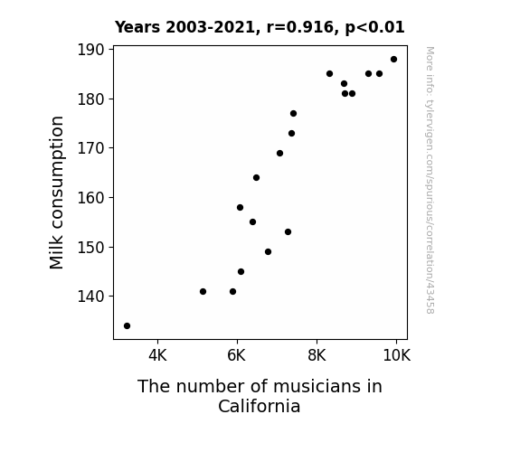 This means 84% of the change in the one variable (i.e., The number of musicians in California) is predictable based on the change in the other (i.e., Milk consumption) over the 19 years from 2003 through 2021.