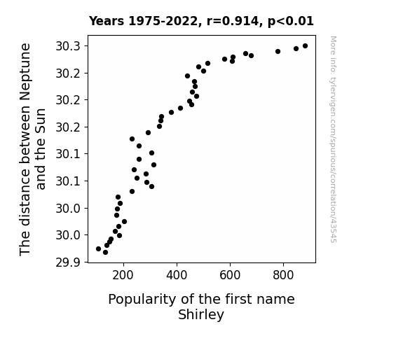 This means 83.5% of the change in the one variable (i.e., Popularity of the first name Shirley) is predictable based on the change in the other (i.e., The distance between Neptune and the Sun) over the 48 years from 1975 through 2022.