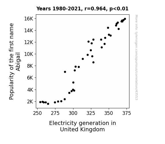 This means 92.8% of the change in the one variable (i.e., Electricity generation in United Kingdom) is predictable based on the change in the other (i.e., Popularity of the first name Abigail) over the 42 years from 1980 through 2021.