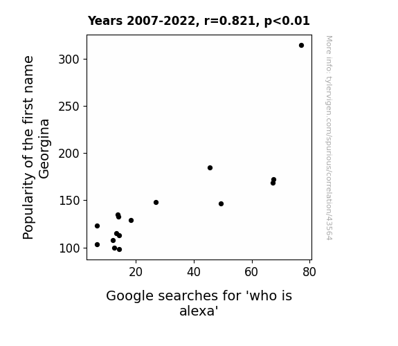 This means 67.4% of the change in the one variable (i.e., Google searches for 'who is alexa') is predictable based on the change in the other (i.e., Popularity of the first name Georgina) over the 16 years from 2007 through 2022.