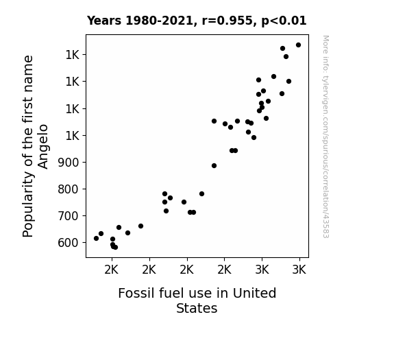 This means 91.2% of the change in the one variable (i.e., Fossil fuel use in United States) is predictable based on the change in the other (i.e., Popularity of the first name Angelo) over the 42 years from 1980 through 2021.