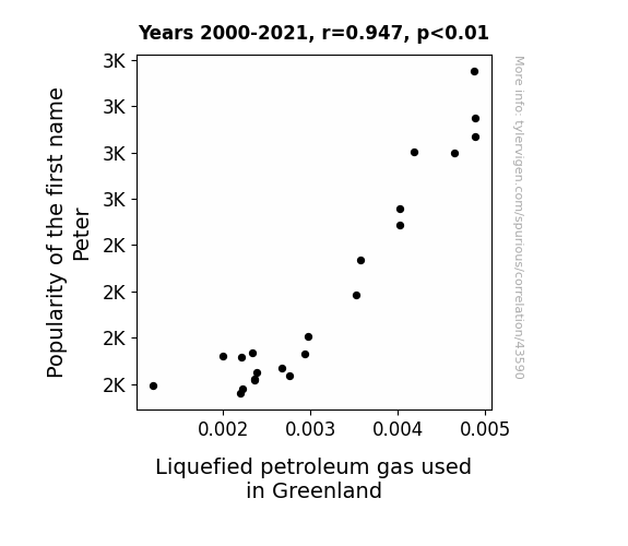 This means 89.7% of the change in the one variable (i.e., Liquefied petroleum gas used in Greenland) is predictable based on the change in the other (i.e., Popularity of the first name Peter) over the 22 years from 2000 through 2021.