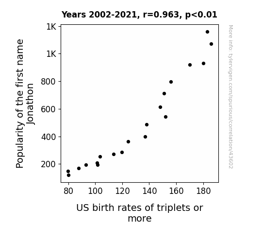 This means 92.7% of the change in the one variable (i.e., US birth rates of triplets or more) is predictable based on the change in the other (i.e., Popularity of the first name Jonathon) over the 20 years from 2002 through 2021.