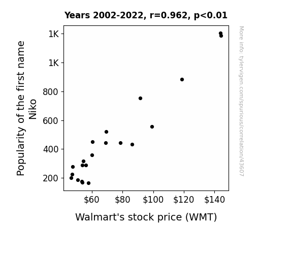 This means 92.6% of the change in the one variable (i.e., Walmart's stock price (WMT)) is predictable based on the change in the other (i.e., Popularity of the first name Niko) over the 21 years from 2002 through 2022.
