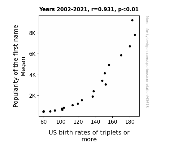 This means 86.6% of the change in the one variable (i.e., US birth rates of triplets or more) is predictable based on the change in the other (i.e., Popularity of the first name Megan) over the 20 years from 2002 through 2021.