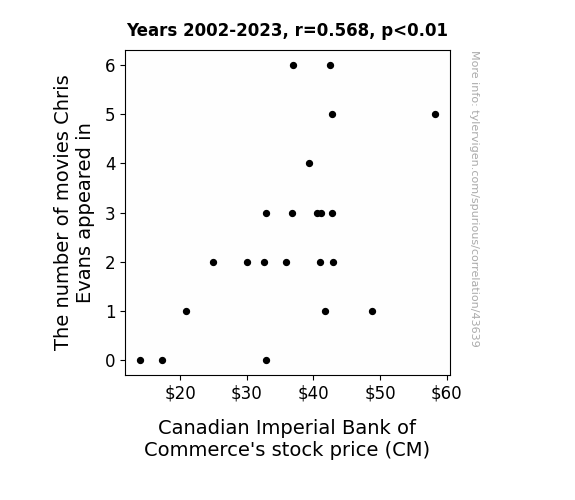 This means 32.2% of the change in the one variable (i.e., Canadian Imperial Bank of Commerce's stock price (CM)) is predictable based on the change in the other (i.e., The number of movies Chris Evans appeared in) over the 22 years from 2002 through 2023.