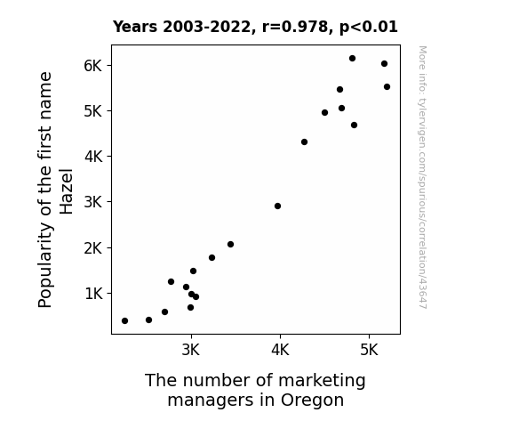 This means 95.7% of the change in the one variable (i.e., The number of marketing managers in Oregon) is predictable based on the change in the other (i.e., Popularity of the first name Hazel) over the 20 years from 2003 through 2022.