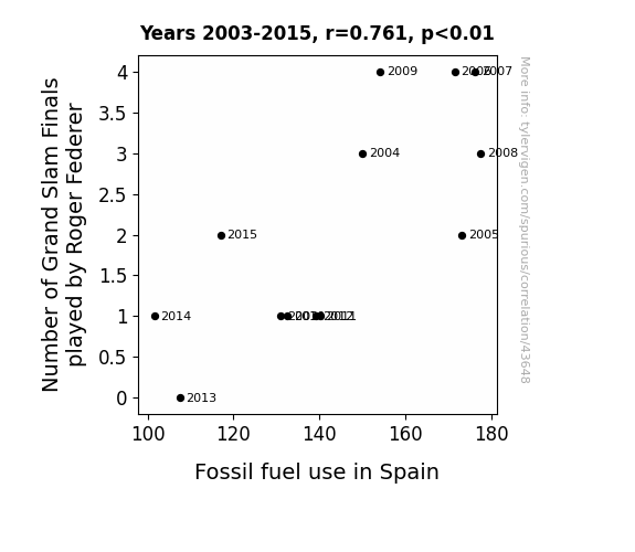 This means 57.8% of the change in the one variable (i.e., Fossil fuel use in Spain) is predictable based on the change in the other (i.e., Number of Grand Slam Finals played by Roger Federer) over the 13 years from 2003 through 2015.