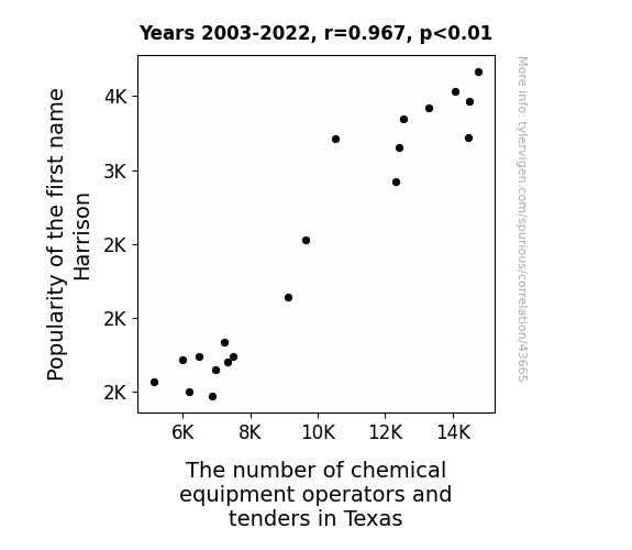 This means 93.5% of the change in the one variable (i.e., The number of chemical equipment operators and tenders in Texas) is predictable based on the change in the other (i.e., Popularity of the first name Harrison) over the 20 years from 2003 through 2022.
