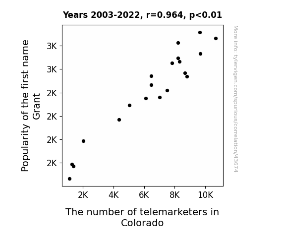 This means 92.9% of the change in the one variable (i.e., The number of telemarketers in Colorado) is predictable based on the change in the other (i.e., Popularity of the first name Grant) over the 20 years from 2003 through 2022.