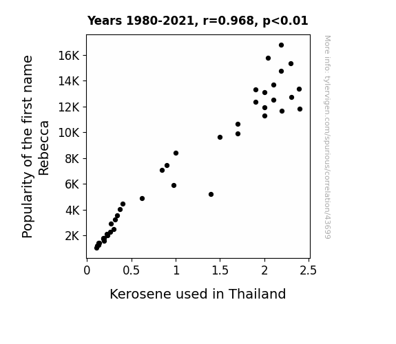 This means 93.6% of the change in the one variable (i.e., Kerosene used in Thailand) is predictable based on the change in the other (i.e., Popularity of the first name Rebecca) over the 42 years from 1980 through 2021.
