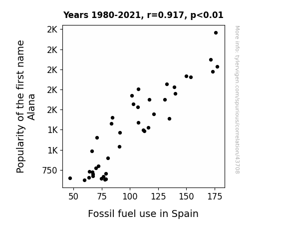 This means 84.1% of the change in the one variable (i.e., Fossil fuel use in Spain) is predictable based on the change in the other (i.e., Popularity of the first name Alana) over the 42 years from 1980 through 2021.