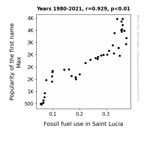 This means 86.4% of the change in the one variable (i.e., Fossil fuel use in Saint Lucia) is predictable based on the change in the other (i.e., Popularity of the first name Max) over the 42 years from 1980 through 2021.