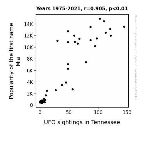 This means 81.9% of the change in the one variable (i.e., UFO sightings in Tennessee) is predictable based on the change in the other (i.e., Popularity of the first name Mia) over the 47 years from 1975 through 2021.
