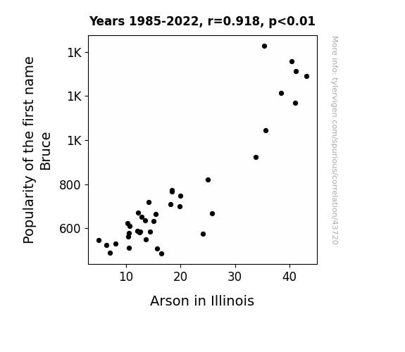 This means 84.3% of the change in the one variable (i.e., Arson in Illinois) is predictable based on the change in the other (i.e., Popularity of the first name Bruce) over the 38 years from 1985 through 2022.
