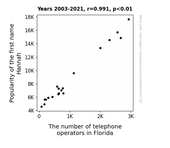 This means 98.3% of the change in the one variable (i.e., The number of telephone operators in Florida) is predictable based on the change in the other (i.e., Popularity of the first name Hannah) over the 19 years from 2003 through 2021.
