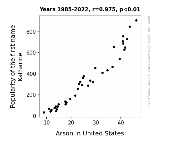 This means 95% of the change in the one variable (i.e., Arson in United States) is predictable based on the change in the other (i.e., Popularity of the first name Katharine) over the 38 years from 1985 through 2022.