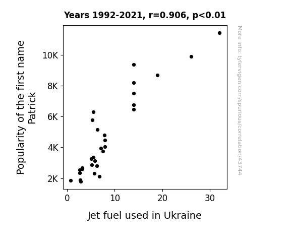 This means 82.1% of the change in the one variable (i.e., Jet fuel used in Ukraine) is predictable based on the change in the other (i.e., Popularity of the first name Patrick) over the 30 years from 1992 through 2021.