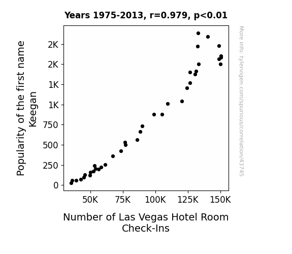 This means 95.8% of the change in the one variable (i.e., Number of Las Vegas Hotel Room Check-Ins) is predictable based on the change in the other (i.e., Popularity of the first name Keegan) over the 39 years from 1975 through 2013.