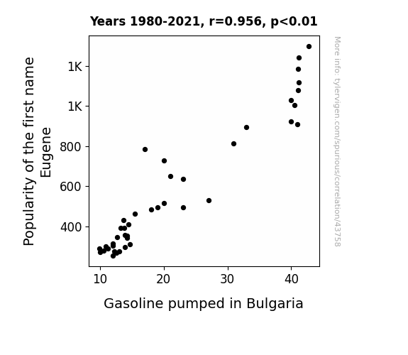 This means 91.3% of the change in the one variable (i.e., Gasoline pumped in Bulgaria) is predictable based on the change in the other (i.e., Popularity of the first name Eugene) over the 42 years from 1980 through 2021.