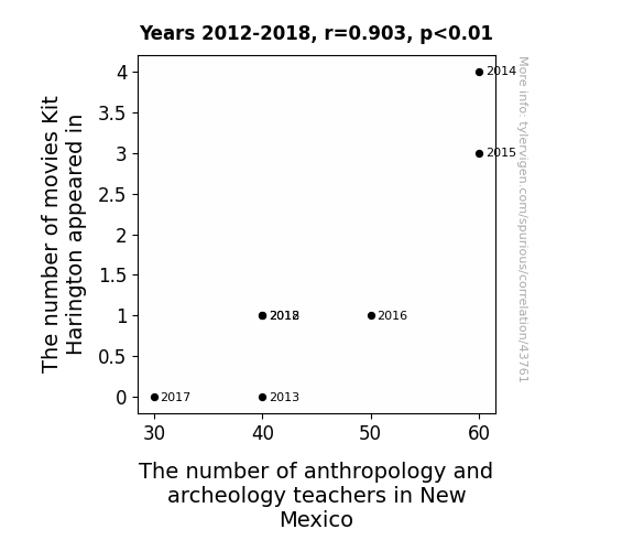 This means 81.5% of the change in the one variable (i.e., The number of anthropology and archeology teachers in New Mexico) is predictable based on the change in the other (i.e., The number of movies Kit Harington appeared in) over the 7 years from 2012 through 2018.