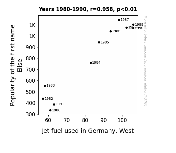 This means 91.8% of the change in the one variable (i.e., Jet fuel used in Germany, West) is predictable based on the change in the other (i.e., Popularity of the first name Elise) over the 11 years from 1980 through 1990.
