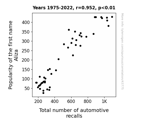 This means 90.6% of the change in the one variable (i.e., Total number of automotive recalls) is predictable based on the change in the other (i.e., Popularity of the first name Aliza) over the 48 years from 1975 through 2022.