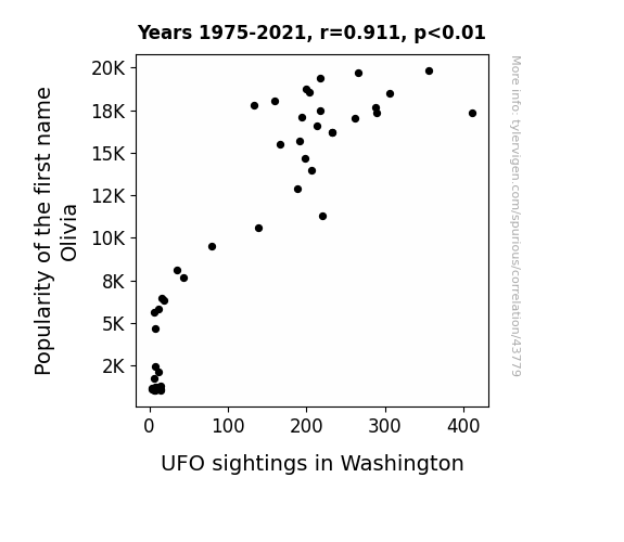 This means 83% of the change in the one variable (i.e., UFO sightings in Washington) is predictable based on the change in the other (i.e., Popularity of the first name Olivia) over the 47 years from 1975 through 2021.