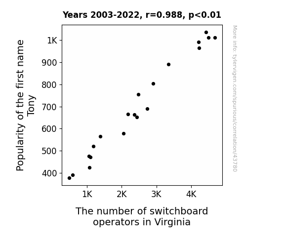 This means 97.6% of the change in the one variable (i.e., The number of switchboard operators in Virginia) is predictable based on the change in the other (i.e., Popularity of the first name Tony) over the 20 years from 2003 through 2022.