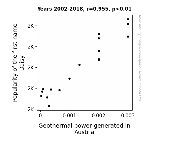 This means 91.3% of the change in the one variable (i.e., Geothermal power generated in Austria) is predictable based on the change in the other (i.e., Popularity of the first name Daisy) over the 17 years from 2002 through 2018.