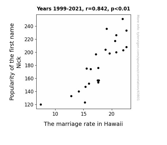 This means 70.9% of the change in the one variable (i.e., The marriage rate in Hawaii) is predictable based on the change in the other (i.e., Popularity of the first name Nick) over the 23 years from 1999 through 2021.