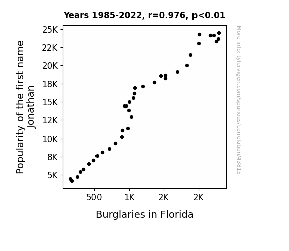 This means 95.3% of the change in the one variable (i.e., Burglaries in Florida) is predictable based on the change in the other (i.e., Popularity of the first name Jonathan) over the 38 years from 1985 through 2022.