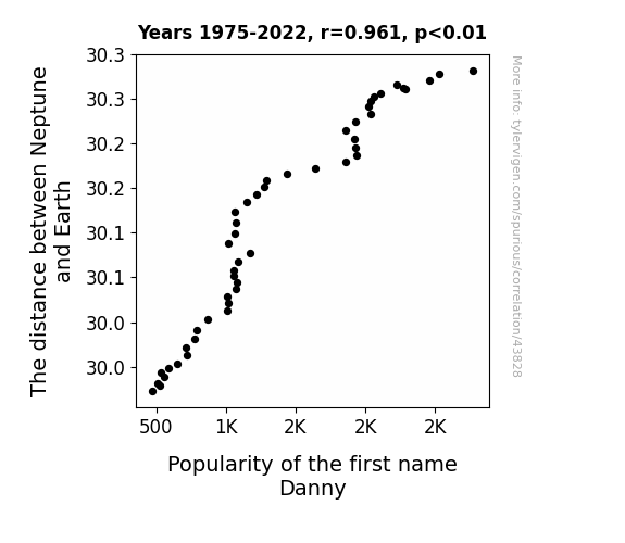This means 92.3% of the change in the one variable (i.e., Popularity of the first name Danny) is predictable based on the change in the other (i.e., The distance between Neptune and Earth) over the 48 years from 1975 through 2022.