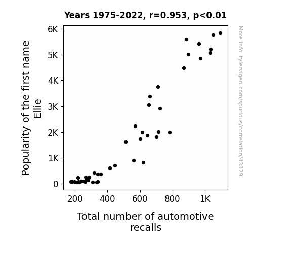 This means 90.9% of the change in the one variable (i.e., Total number of automotive recalls) is predictable based on the change in the other (i.e., Popularity of the first name Ellie) over the 48 years from 1975 through 2022.