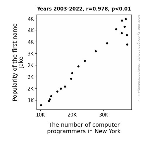 This means 95.6% of the change in the one variable (i.e., The number of computer programmers in New York) is predictable based on the change in the other (i.e., Popularity of the first name Jake) over the 20 years from 2003 through 2022.