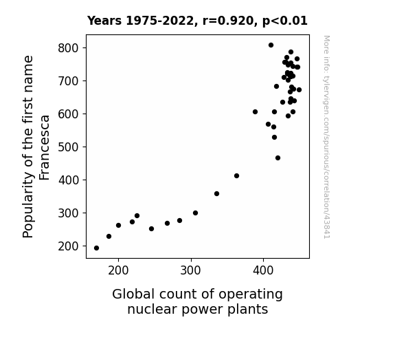 This means 84.6% of the change in the one variable (i.e., Global count of operating nuclear power plants) is predictable based on the change in the other (i.e., Popularity of the first name Francesca) over the 48 years from 1975 through 2022.