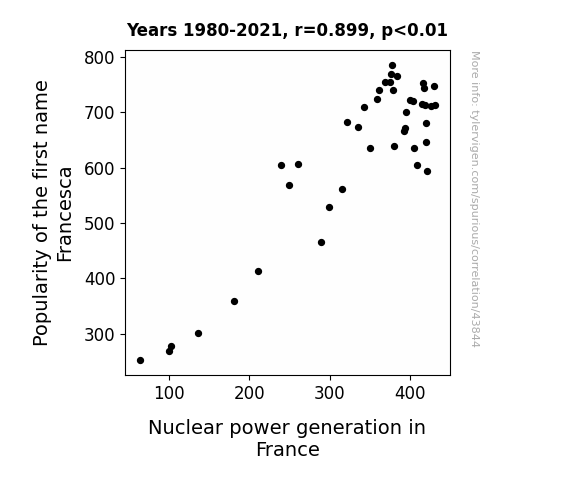 This means 80.7% of the change in the one variable (i.e., Nuclear power generation in France) is predictable based on the change in the other (i.e., Popularity of the first name Francesca) over the 42 years from 1980 through 2021.