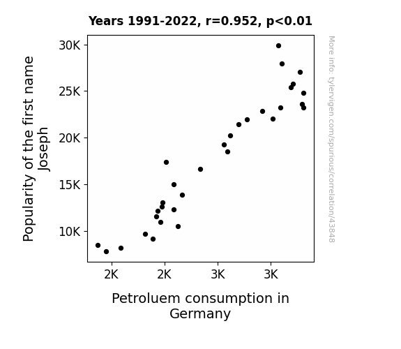 This means 90.7% of the change in the one variable (i.e., Petroluem consumption in Germany) is predictable based on the change in the other (i.e., Popularity of the first name Joseph) over the 32 years from 1991 through 2022.