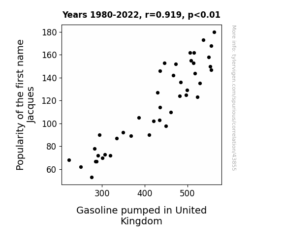 This means 84.5% of the change in the one variable (i.e., Gasoline pumped in United Kingdom) is predictable based on the change in the other (i.e., Popularity of the first name Jacques) over the 43 years from 1980 through 2022.