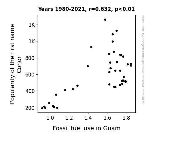 This means 40% of the change in the one variable (i.e., Fossil fuel use in Guam) is predictable based on the change in the other (i.e., Popularity of the first name Conor) over the 42 years from 1980 through 2021.