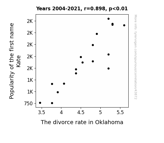This means 80.6% of the change in the one variable (i.e., The divorce rate in Oklahoma) is predictable based on the change in the other (i.e., Popularity of the first name Kate) over the 18 years from 2004 through 2021.
