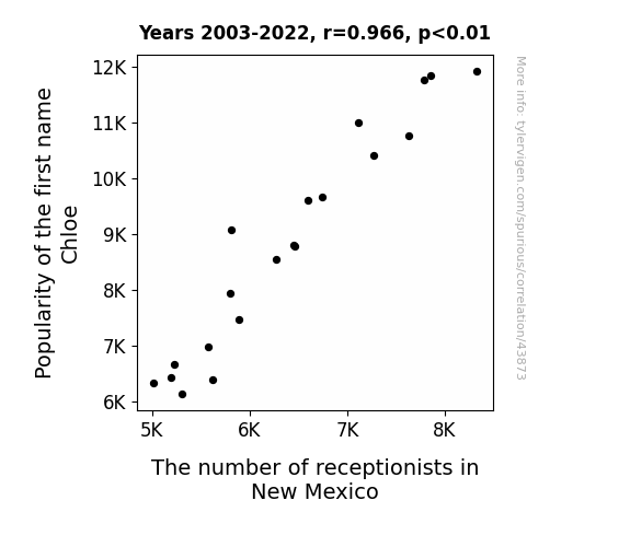 This means 93.3% of the change in the one variable (i.e., The number of receptionists in New Mexico) is predictable based on the change in the other (i.e., Popularity of the first name Chloe) over the 20 years from 2003 through 2022.