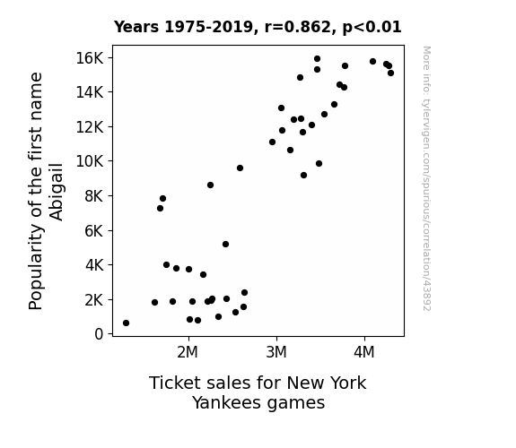 This means 74.3% of the change in the one variable (i.e., Ticket sales for New York Yankees games) is predictable based on the change in the other (i.e., Popularity of the first name Abigail) over the 45 years from 1975 through 2019.