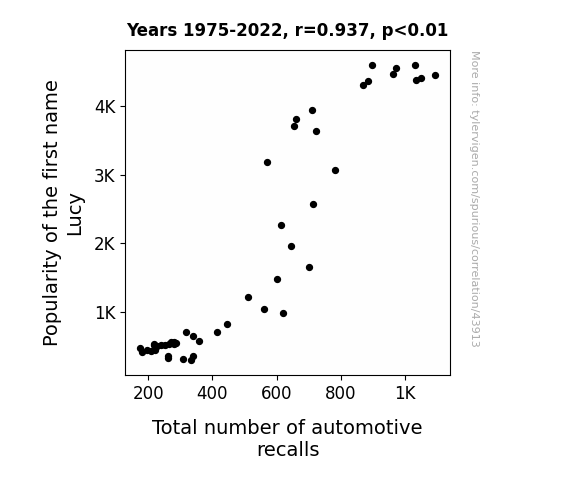 This means 87.9% of the change in the one variable (i.e., Total number of automotive recalls) is predictable based on the change in the other (i.e., Popularity of the first name Lucy) over the 48 years from 1975 through 2022.
