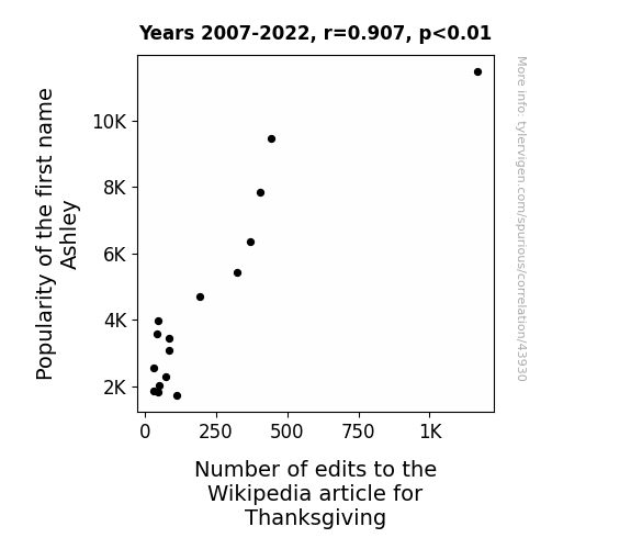 This means 82.2% of the change in the one variable (i.e., Number of edits to the Wikipedia article for Thanksgiving) is predictable based on the change in the other (i.e., Popularity of the first name Ashley) over the 16 years from 2007 through 2022.