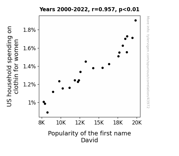 This means 91.5% of the change in the one variable (i.e., Popularity of the first name David) is predictable based on the change in the other (i.e., US household spending on clothin for women) over the 23 years from 2000 through 2022.