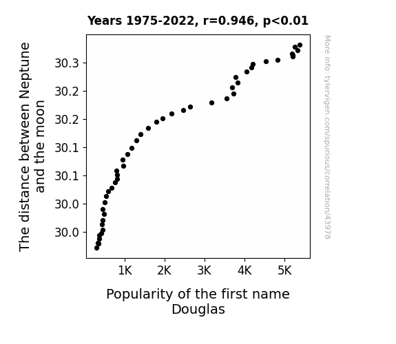This means 89.5% of the change in the one variable (i.e., Popularity of the first name Douglas) is predictable based on the change in the other (i.e., The distance between Neptune and the moon) over the 48 years from 1975 through 2022.