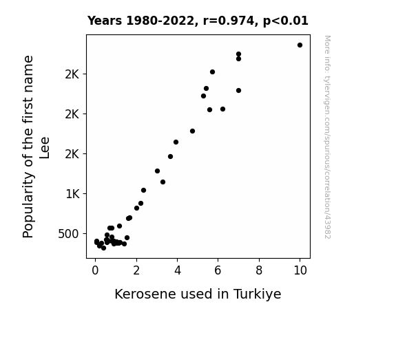 This means 94.8% of the change in the one variable (i.e., Kerosene used in Turkiye) is predictable based on the change in the other (i.e., Popularity of the first name Lee) over the 43 years from 1980 through 2022.